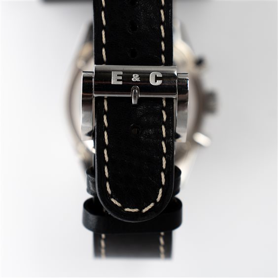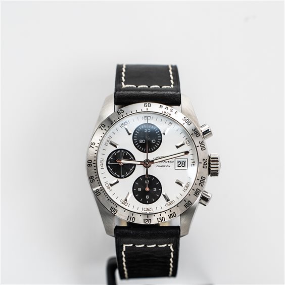 Orologio meccanico automatico con funzione cronografo con datario. Cassa acciaio inox con fondello acciaio inox fissato con 6 viti. Quadrante di colore bianco con 3 contatori di colore nero, indici lucidi e datario alle ore 3. Cinturino in pelle nera con impunture bianche, fibbia logata ad ardiglione. Impermeabilità 5ATM con corona a vite.
