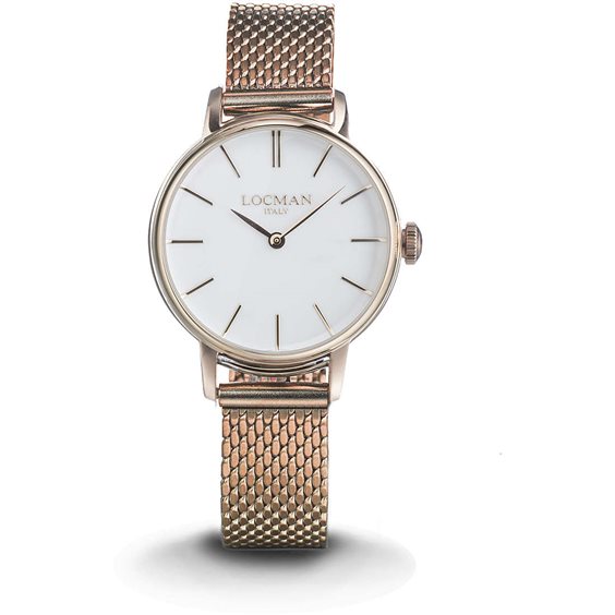 Orologio Solo Tempo della collezione 1960 LADY, dal Design elegante con linee pulite ed essenziali. La collezione LOCMAN 1960 LADY interpreta le atmosfere dei nostri giorni, così vicine a quelle dei primi anni Sessanta, il decennio più glamour di sempre. Il movimento è al quarzo high-tech, la cassa da 32mm è in acciaio AISI316L con trattamento PVD rosè gold. Il vetro minerale è reso più duro e resistente grazie a uno speciale trattamento zaffiro. L’impermeabilità dell’orologio è garantita fino a 5 ATM (50 mt). Il bracciale in finissima maglia Milano è in acciaio inossidabile con trattamento PVD rosè gold, dotato di una chiusura che consente di regolarlo in modo semplice e veloce.