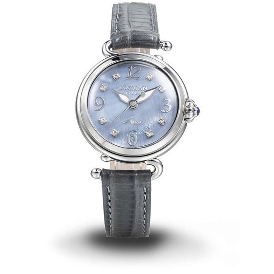 Orologio da donna della collezione "Amo". Movimento Solo Tempo al Quarzo. Un orologio dalla linea elegante e pulita che, grazie al suo particolare design ispirato agli ami dei pescatori, ricorda il forte legame del brand con il mare. Cassa in acciaio AISI316L, chiusa da un fondello in titanio. Il quadrante in madreperla grigia è sormontato da un vetro con trattamento zaffiro, e la corona a cabochon è decorata con un piccolo vetro smaltato nella tonalità blu profondo. Sul quadrante sono applicati, in rilievo, numeri arabi e indici con 8 diamanti taglio brillante(0,15kt). Impermeabilità 5ATM.