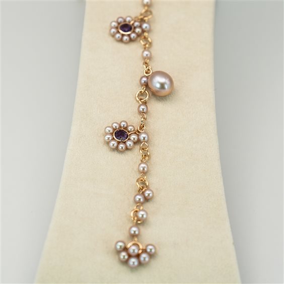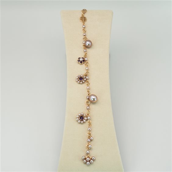 Bracciale in Oro rosa 18kt con 2 perle viola coltivate di alta qualità a ciondolo e tre ciondoli con ametista e logo in oro rosa 18kt. I gioielli Mimì sono creazioni uniche, sono storie di donne, viaggi ed emozioni. Perle e pietre dei colori più ricercati che incontrano lo stile e l'autenticità italiana.