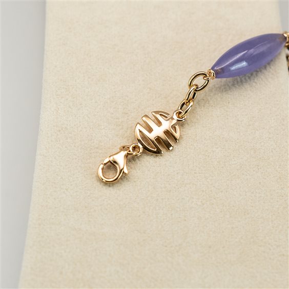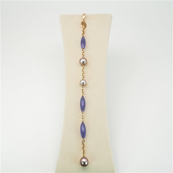 Bracciale in Oro rosa 18kt con 3 perle viola coltivate di alta qualità e tre fusi in giada lavanda e logo in oro rosa 18kt. I gioielli Mimì sono creazioni uniche, sono storie di donne, viaggi ed emozioni. Perle e pietre dei colori più ricercati che incontrano lo stile e l'autenticità italiana.