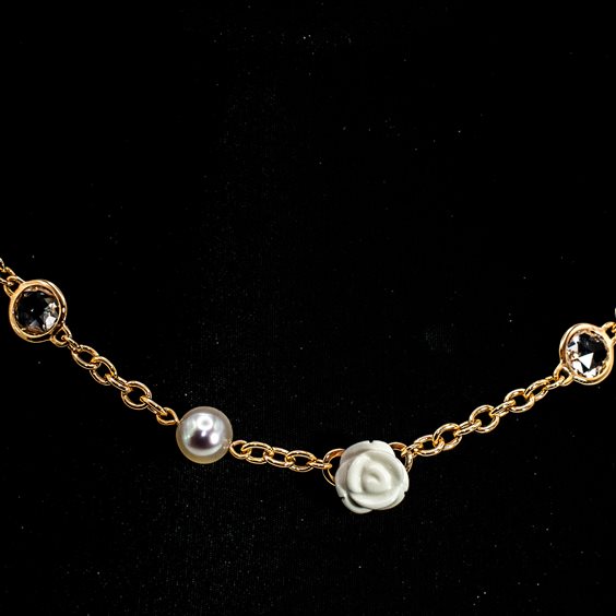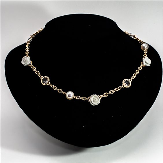 Collana in oro rosa 18kt con perle bianche coltivate di alta qualità, roselline in agata bianca e dischetti in cristallo di rocca. I gioielli Mimì sono creazioni uniche, sono storie di donne, viaggi ed emozioni. Perle e pietre dei colori più ricercati che incontrano lo stile e l'autenticità italiana.