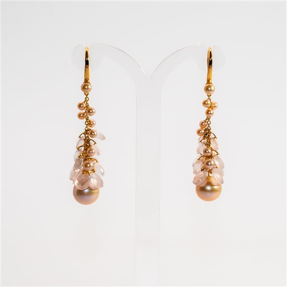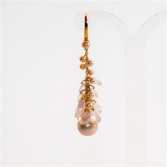 Orecchini pendenti a grappolo in Oro rosa 18kt con piccole perle rosa coltivate di alta qualità e gocce in quarzo rosa e sul pendente una grande perla rosa coltivata di alta qualità. I gioielli Mimì sono creazioni uniche, sono storie di donne, viaggi ed emozioni. Perle e pietre dei colori più ricercati che incontrano lo stile e l'autenticità italiana.