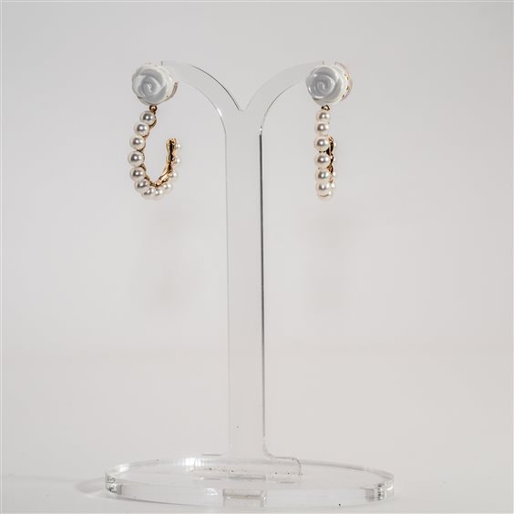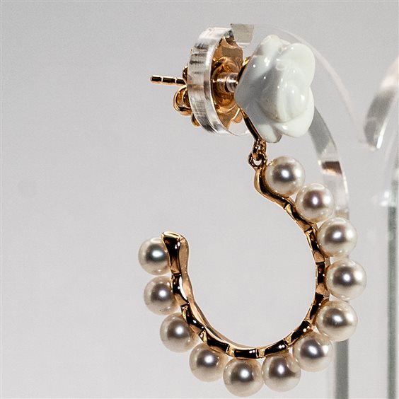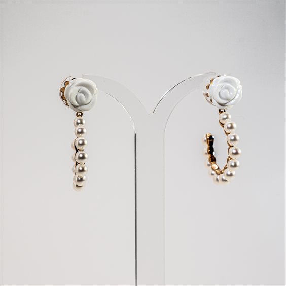 Orecchini in Oro rosa 18kt con rosa in agata bianca a lobo e cerchio pendente di perle bianche coltivate di alta qualità. I gioielli Mimì sono creazioni uniche, sono storie di donne, viaggi ed emozioni. Perle e pietre dei colori più ricercati che incontrano lo stile e l'autenticità italiana.