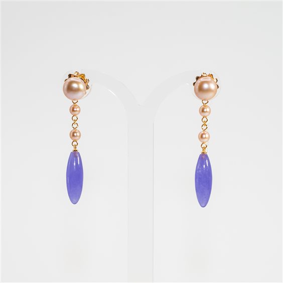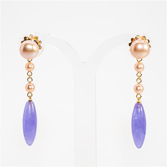 Orecchini in oro rosa 18kt con, a lobo, una perla viola coltivata di alta qualità e pendente con perline viola coltivate di alta qualità e giada lavanda a forma di fuso. I gioielli Mimì sono creazioni uniche, sono storie di donne, viaggi ed emozioni. Perle e pietre dei colori più ricercati che incontrano lo stile e l'autenticità italiana.