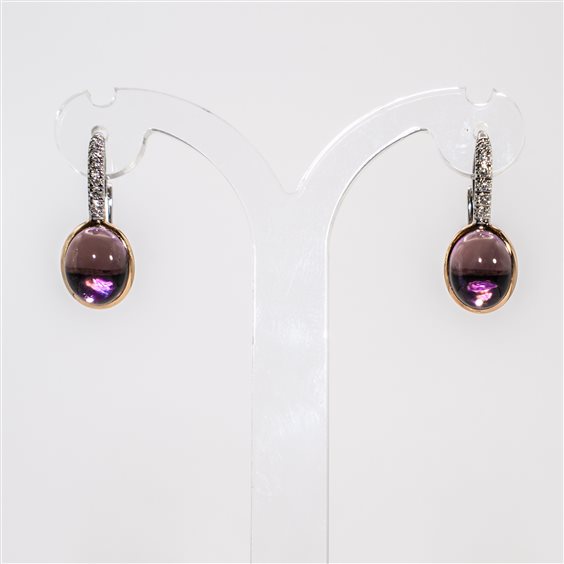 Orecchini pendenti con chiusura a monachina in oro bianco 18kt e Diamanti taglio brillante con cabochon di Ametista ovale su castone in oro rosa 18kt.