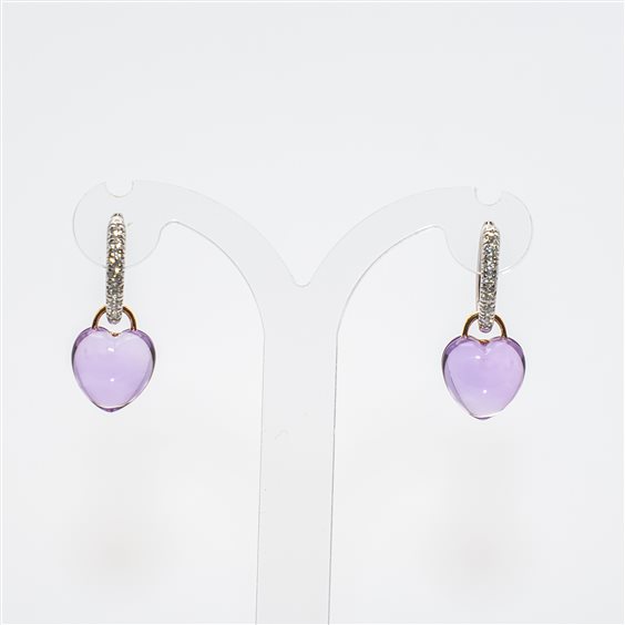 Orecchini cerchietto ovale a lobo in oro bianco 18kt con diamanti taglio brillante e Pendente in ametista a forma di cuore rilegato in oro rosa 18kt. Lunghezza totale dell'orecchino cm 2,5.