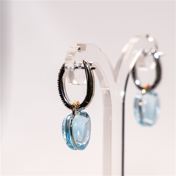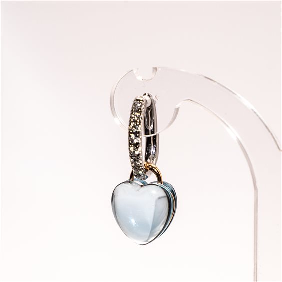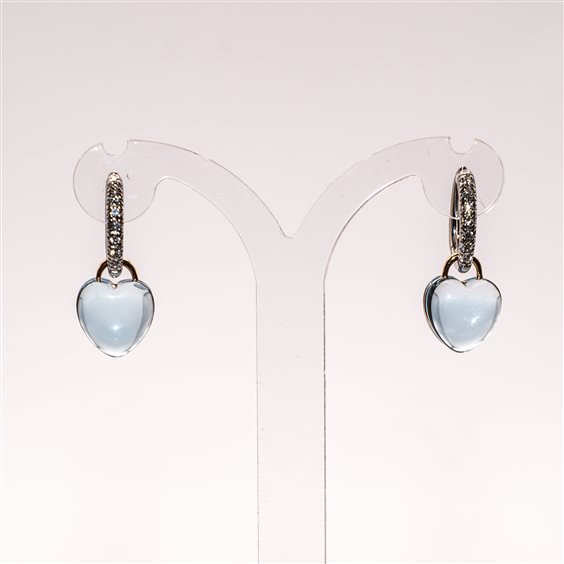 Orecchini cerchietto ovale a lobo in oro bianco 18kt con diamanti taglio brillante e Pendente in topazio azzurro a forma di cuore rilegato in oro rosa 18kt. Lunghezza totale dell'orecchino cm 2,5.