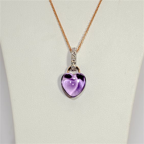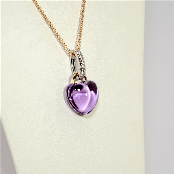 Girocollo in oro rosa 18kt con Pendente in ametista a forma di cuore rilegato in oro rosa 18kt e contromaglia in oro bianco 18kt e diamanti taglio brillante. I gioielli Mimì sono creazioni uniche, sono storie di donne, viaggi ed emozioni. Perle e pietre dei colori più ricercati che incontrano lo stile e l'autenticità italiana.