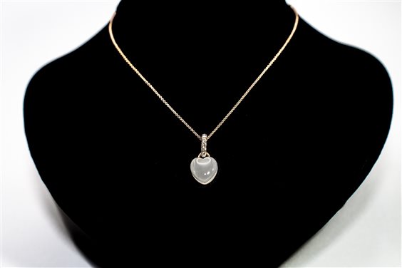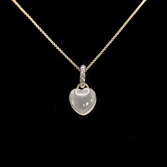 Girocollo in oro rosa 18kt con Pendente in quarzo milk a forma di cuore rilegato in oro rosa 18kt e contromaglia in oro bianco 18kt e diamanti taglio brillante. I gioielli Mimì sono creazioni uniche, sono storie di donne, viaggi ed emozioni. Perle e pietre dei colori più ricercati che incontrano lo stile e l'autenticità italiana.