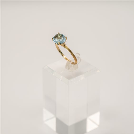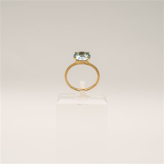 Anello in oro giallo 18kt con topazio azzurro faccettato ovale. La superfice dell'anello è resa unica da una speciale, e molto antica, lavorazione artigianale: l’incisione al bulino millerighe. Con questo strumento, e con una grande esperienza capace di combinare forza e delicatezza allo stesso tempo, gli incisori disegnano solchi profondi conferendo al gioiello una parvenza morbida, simile a quella della seta e straordinariamente brillante. Le collezioni NANIS raccontano di un gioiello rinnovato e contemporaneo. Si inseriscono a pieno titolo nel nostro straordinario Made in Italy.