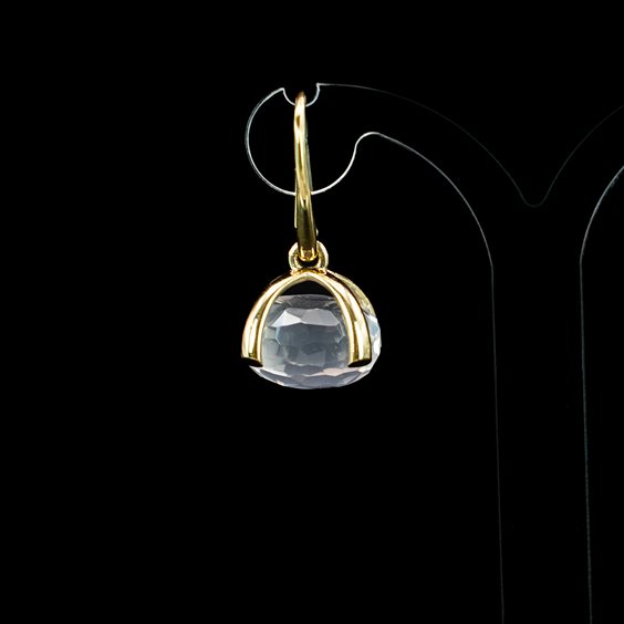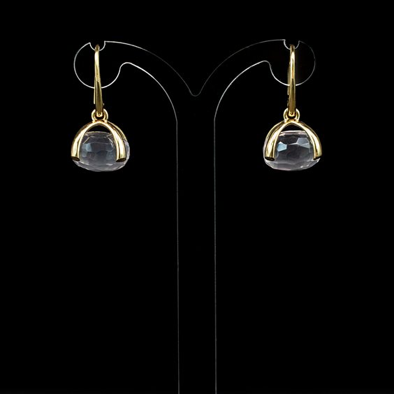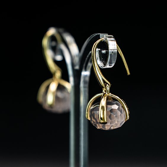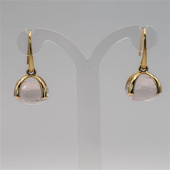 Orecchini pendenti in oro giallo con quarzo rosa faccettato ovale nel ciondolo. Le collezioni NANIS raccontano di un gioiello rinnovato e contemporaneo. Si inseriscono a pieno titolo nel nostro straordinario Made in Italy.