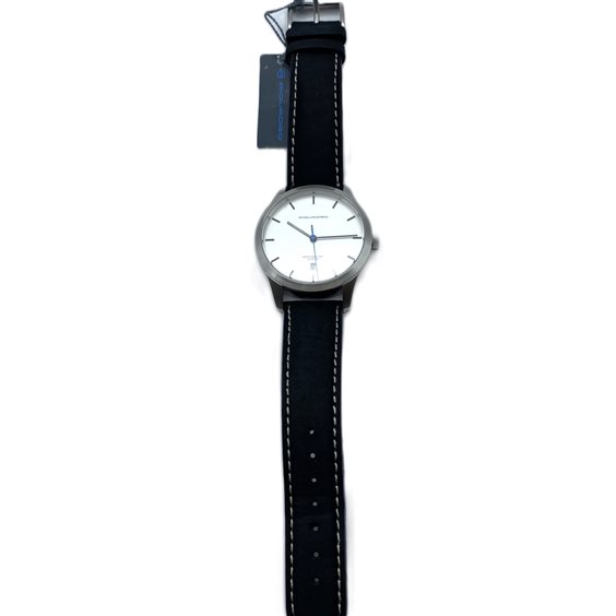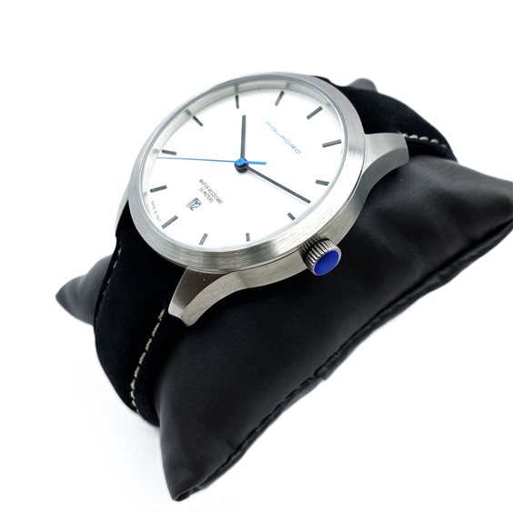 Orologio uomo con movimento meccanico automatico tre sfere. Cassa in acciaio satinato, fondello in acciaio anallergico fissato con 4 viti e vetro trattato anti graffio. Quadrante di colore bianco con indici applicati neri, particolari azzurri e datario alle ore 6. Cinturino in pelle di Nabuk scamosciato di colore nero con impunture bianche. Water resistant 5ATM.